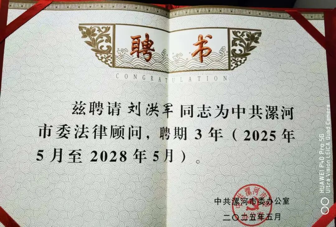 刘洪军律师表示本次获聘背后,是他作为中共党员对 “为人民服务” 宗旨的践行,是对律师职业 “维护公平正义” 使命的坚守。未来,刘洪军律师将继续以更专业的服务、更饱满的热情投身法治建设,为漯河的经济社会发展提供坚实的法律保障,书写新时代法律人的使命与荣光。